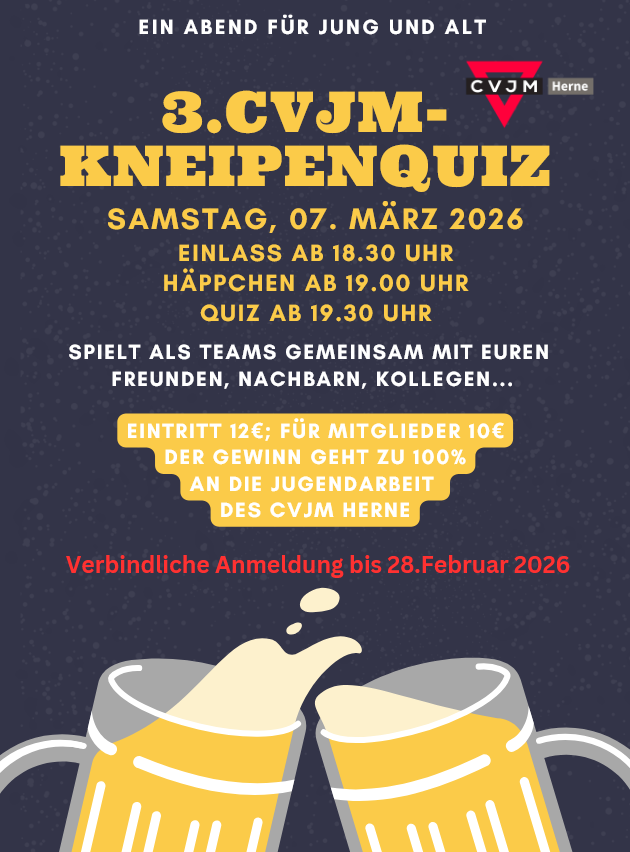 gute Traditionen wollen gepflegt werden. Daher laden wir Sie und euch erneut ganz herzlich zum 3. CVJM Kneipenquiz ein, einem Abend für die ganze Familie.